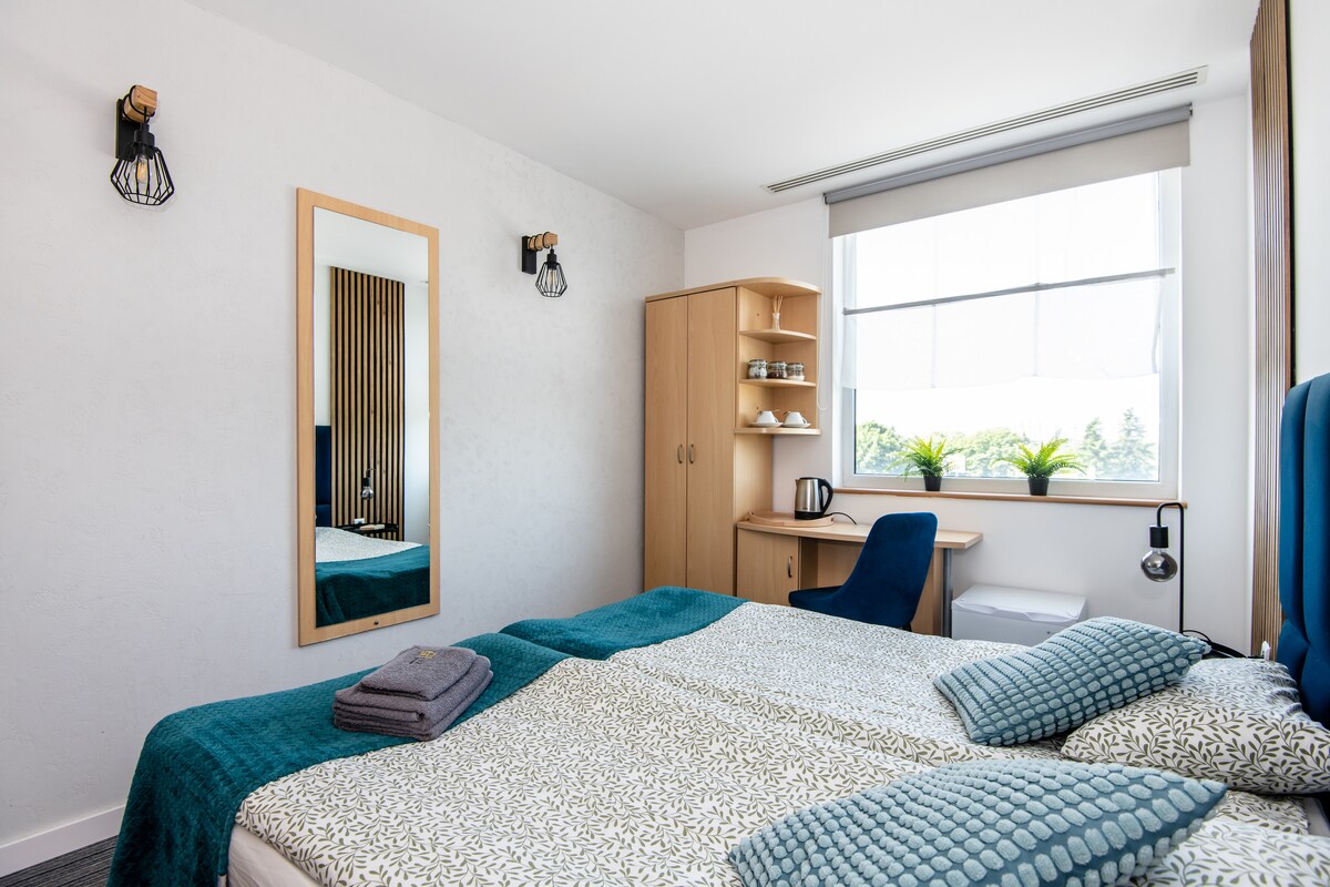 Amplia y moderna habitación con dos camas individuales con baño privado en un hotel en la calle Lechicka en Poznan. La habitación consta de dos camas individuales, que se pueden juntar si es necesario, un armario, un escritorio, un televisor y un baño separado con ducha. Parada de autobús, parques, tiendas de comestibles y centro comercial Poznan Plaza cerca. A 15 minutos en auto del centro de la ciudad. También hay un restaurante de hotel abajo. Estamos esperando tu reservación. :)