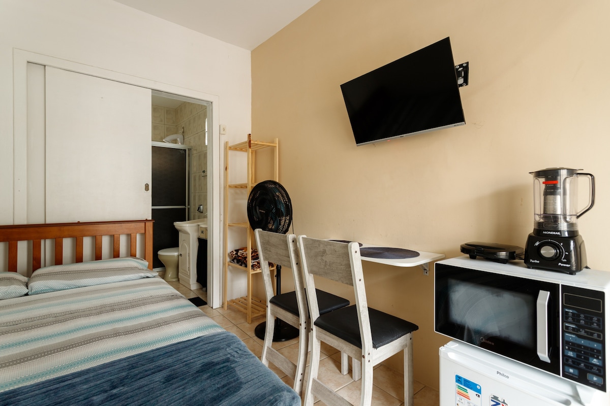 Studio tranquilo, bem ventilado e confortável, ideal para trabalhar home office, ar-condicionado QUENTE /frio, passear e estar na região central de Floripa, no caminho para as melhores praias. Mesa e cadeira de escritório, cozinha, banheiro. Há outros espaços compartilhados, para práticas de Yoga (espaço Casa Aflorar), privilegiada vista para a Beiramar e região, cercada por vegetação nativa, jardins. Internet fibra, airfryer, cortinas black-out.Academias de musculação próximas,ciclovias.