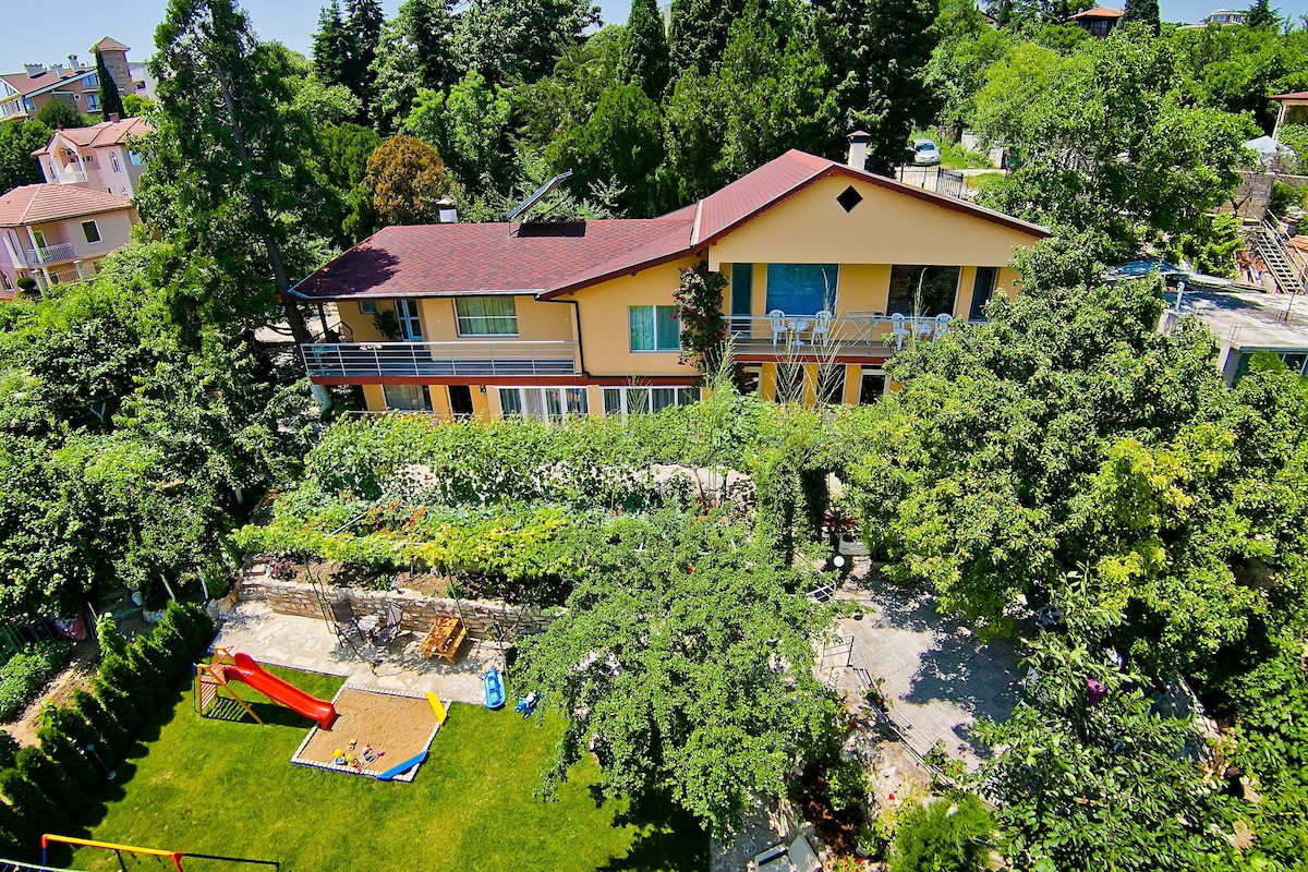 Love Nest Guest House-Varna Escondida en el corazón del bosque y cerca de la pintoresca costa de Varna, la casa ofrece privacidad y tranquilidad, silencio y un ambiente de cuento de hadas. ¡Una maravillosa combinación del placer del mar y la frescura del bosque! Los grandes ventanales en cada habitación revelan cautivadoras vistas del bosque circundante y el mar a lo lejos. Equipo y mobiliario a estrenar. La casa tiene su propio patio vallado con 3 esquinas separadas y una barbacoa.