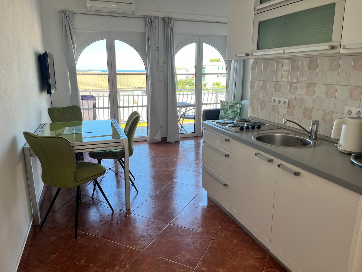 **Apartamento 2 (verde) para 2-3 personas (precio para 4 personas bajo petición):** Sala de estar con un gran sofá cama, balcón soleado y maravillosas vistas al mar. 1 dormitorio con una cama doble. Cocina equipada. Baño con ducha. Servicios adicionales: secador de pelo, plancha, wifi, TV de pantalla plana con canales alemanes, lavadora, parrilla XXXL y aire acondicionado (0,50 €/h - para reservaciones de 12 días o más, 10 horas de aire acondicionado son gratuitas). ---