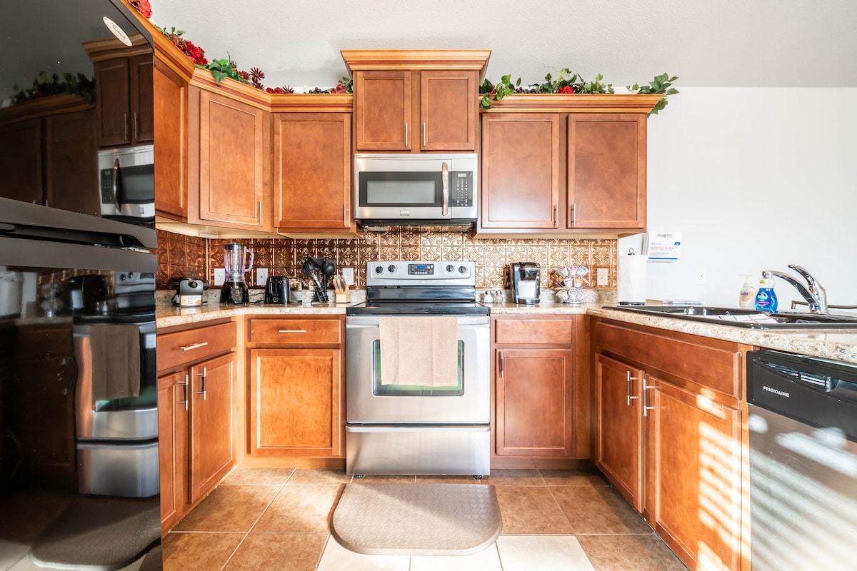 Amplia casa de 4 dormitorios en una tranquila calle sin salida cerca de CSU Pueblo, golf y tiendas. Esta casa de estilo español cuenta con arte occidental, un gran patio trasero privado con cancha deportiva para pickleball y baloncesto, fogata, parrilla, patio, juegos de patio. Interior: techos de 17', TV 4K de 85", sofá de cuero, hornos dobles, Keurig, Wi-Fi rápido y lavandería completa. Suite principal con cama tamaño king, vestidor, bañera de hidromasaje y ducha. Oficina con escritorio de roble y pantalla de 34” para trabajo remoto. Ideal para familias, parejas o grupos