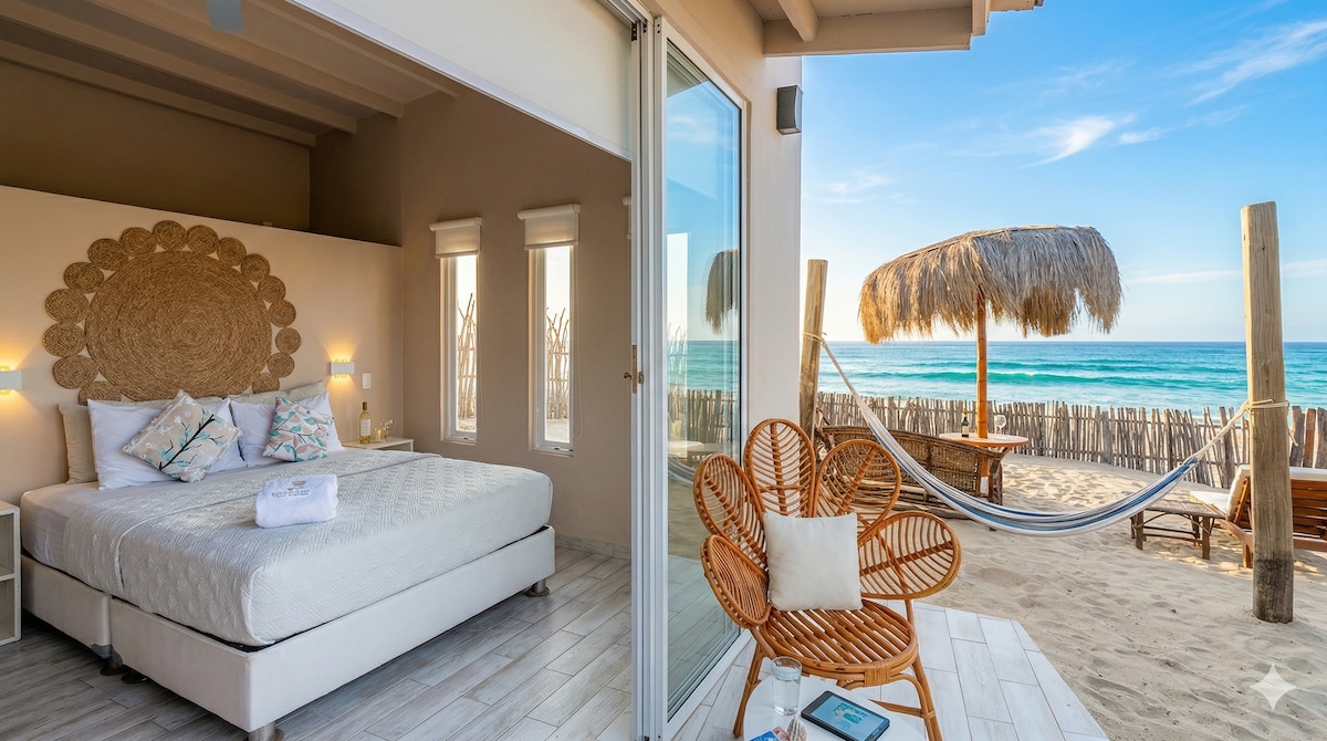 Disfruta de una escapada inolvidable en nuestro Bungalow Lino, un rincón lleno de calma. Despierta con el sonido de las olas, saborea un cafecito en tu terraza privada con vista al mar y disfruta de atardeceres mágicos. Amplio y con un encanto bohemio y rústico, ofrece acceso directo a la playa, un delicioso desayuno incluido y una cocina equipada. Pensado para quienes buscan desconexión y serenidad: aquí, el único sonido es el del mar.