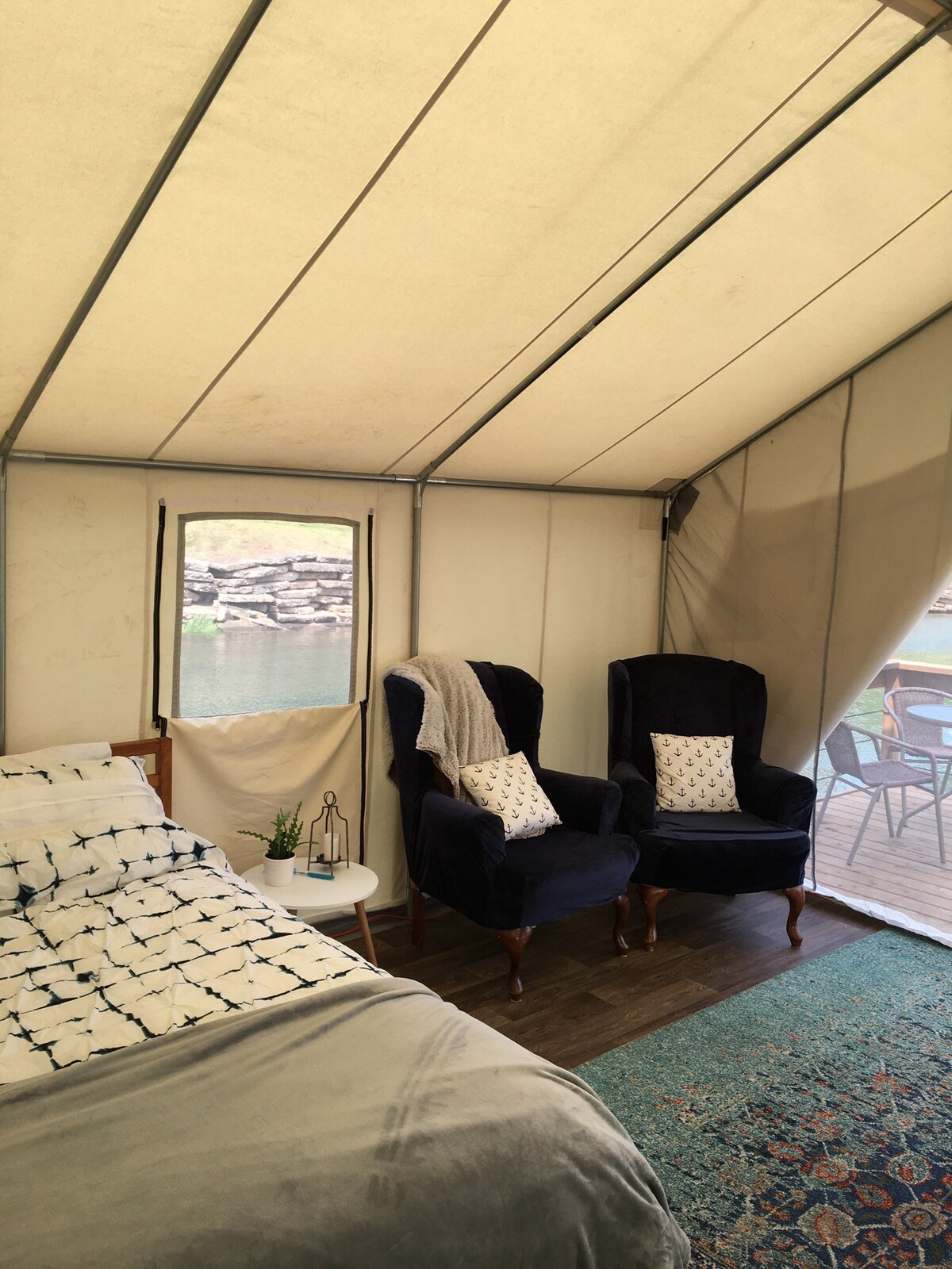 Disfruta de un glamping único con impresionantes vistas al río Cardigan. A poca distancia a pie de tiendas locales, restaurantes y el puerto deportivo. Disfruta de la terraza de 8 pies con un juego de barbacoa y bistró. En el interior encontrarás una cama tamaño queen, un vestidor, un ventilador, una sala de estar y una cocina de campamento. Incluye wifi y electricidad. Los huéspedes tienen acceso 24/7 a un baño en el puerto deportivo con ducha y aparcamiento gratuito. Explora playas cercanas, senderos, kayak y deliciosos mariscos en el encantador pueblo de Cardigan, PEI.