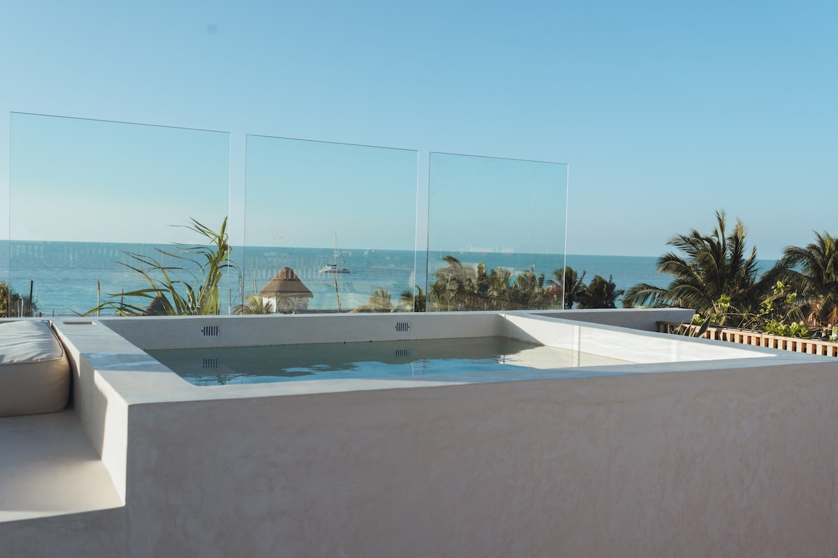 Master suite con vista panorámica al mar caribe y rooftop privado con alberca de inmersión, dos camastros, sala lounge y regadera. Tiene una cama King size, sofá cama y balcón con vista a la playa, proyector de video con aplicaciones streaming y un sistema de sonido. Cuenta con una cocina moderna con estufa eléctrica, refrigerador, microondas, tostadora, cafetera y tetera, con oferta de tés y cafés. Servicios incluidos como free-wifi, toallas de playa, secador de pelo, caja de seguridad.