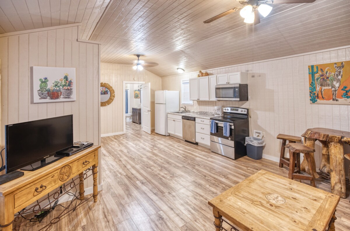 Escápate a nuestra cabaña tipo litera estilo estudio, perfecta para hasta 8 huéspedes con dos camas tamaño queen y dos camas completas. Disfruta de una cocina totalmente equipada, una acogedora sala de estar y una chimenea comunitaria para reuniones nocturnas. Situado a solo media milla del Bent Rim Bar and Grill, la parada oficial de las Three Twisted Sisters, te encantará la comodidad y la gastronomía local. Explora el cercano río Frio y el parque estatal Garner. ¡Café gratis incluido! Reserva tu estancia hoy mismo para vivir una aventura memorable en Texas Hill Country.