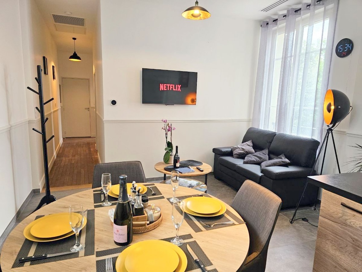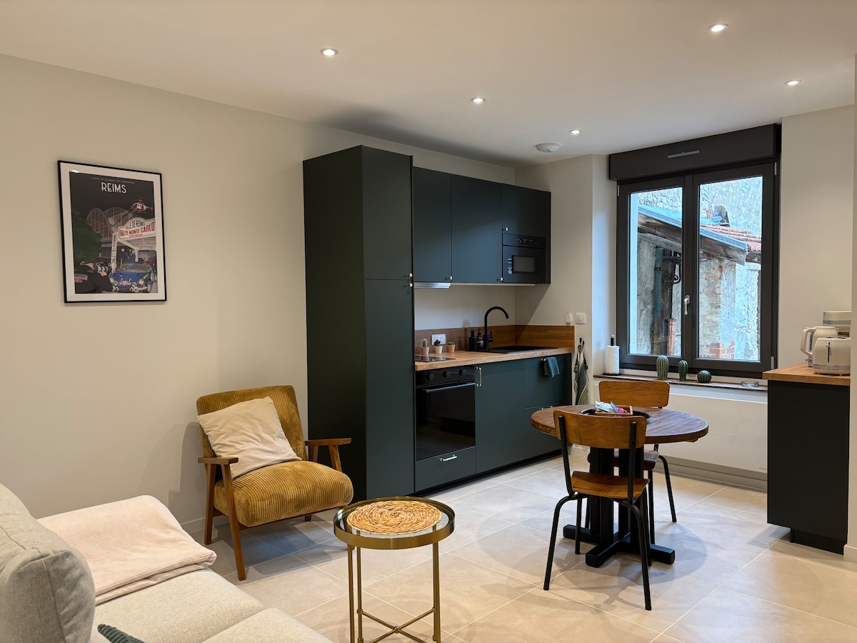 Apartamento luminoso de 32 m² totalmente renovado en el corazón de Reims, en un edificio tranquilo. 1 dormitorio (cama de 140x200) con vestidor, baño, cocina abierta equipada, sala de estar con sofá cama, TV y Wi-Fi. Estacionamiento interior privado con enchufe para carga de vehículo eléctrico. Ropa de cama proporcionada Ideal para una persona sola, una pareja o una corta estancia profesional. A 1,5 km de la estación de tren, cerca de tiendas, restaurantes, catedral, rue de Vesle y grandes casas de Champagne. Llegada autónoma.