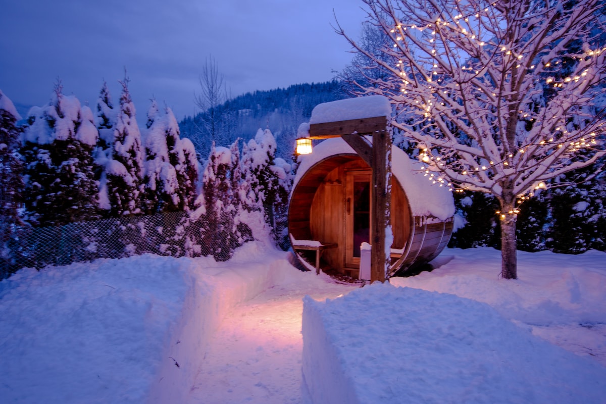 ¡Bienvenido al Bed & Apple Chalet! Una acogedora casa de estilo chalet en 2,5 acres con impresionantes vistas a Boulder Mountain. Ubicada a solo 4 minutos al oeste de Revelstoke, BC, y a 13 minutos del RMR Mountain Resort. Cuenta con dos dormitorios en la planta principal y un loft de dos dormitorios. Cada dormitorio tiene su propio televisor inteligente por cable. Dos baños completos con suelo radiante. Cocina totalmente surtida con barbacoa en la terraza trasera. ¡Este chalet también cuenta con una estufa de leña para esas acogedoras noches de invierno!