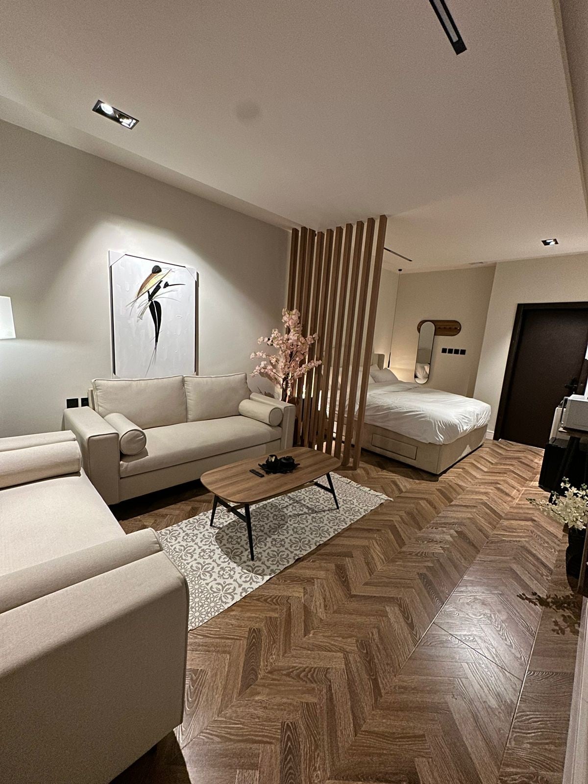 ¡Disfruta de una estancia elegante y moderna en el estudio AAM! Estudio acogedor, iluminación tenue y aislantes acústicos para una comodidad perfecta La ubicación es muy especial: Riyadh Park (5 minutos), centro financiero KAFD (10 minutos), Boulevard y Kingdom Arena (15 minutos), y cerca de las carreteras principales más importantes, como King Fahad Road. Ventajas: cama de hotel de lujo y cómoda, internet de alta velocidad, TV inteligente, cocina: microondas, nevera, lavandería, comedor, zona de café: cafetera, hervidor, tazas, accesorios de hospitalidad, aislantes de sonido para una estancia cómoda y tranquila Ideal para descansar, tanto si estás en un viaje de negocios como de turismo