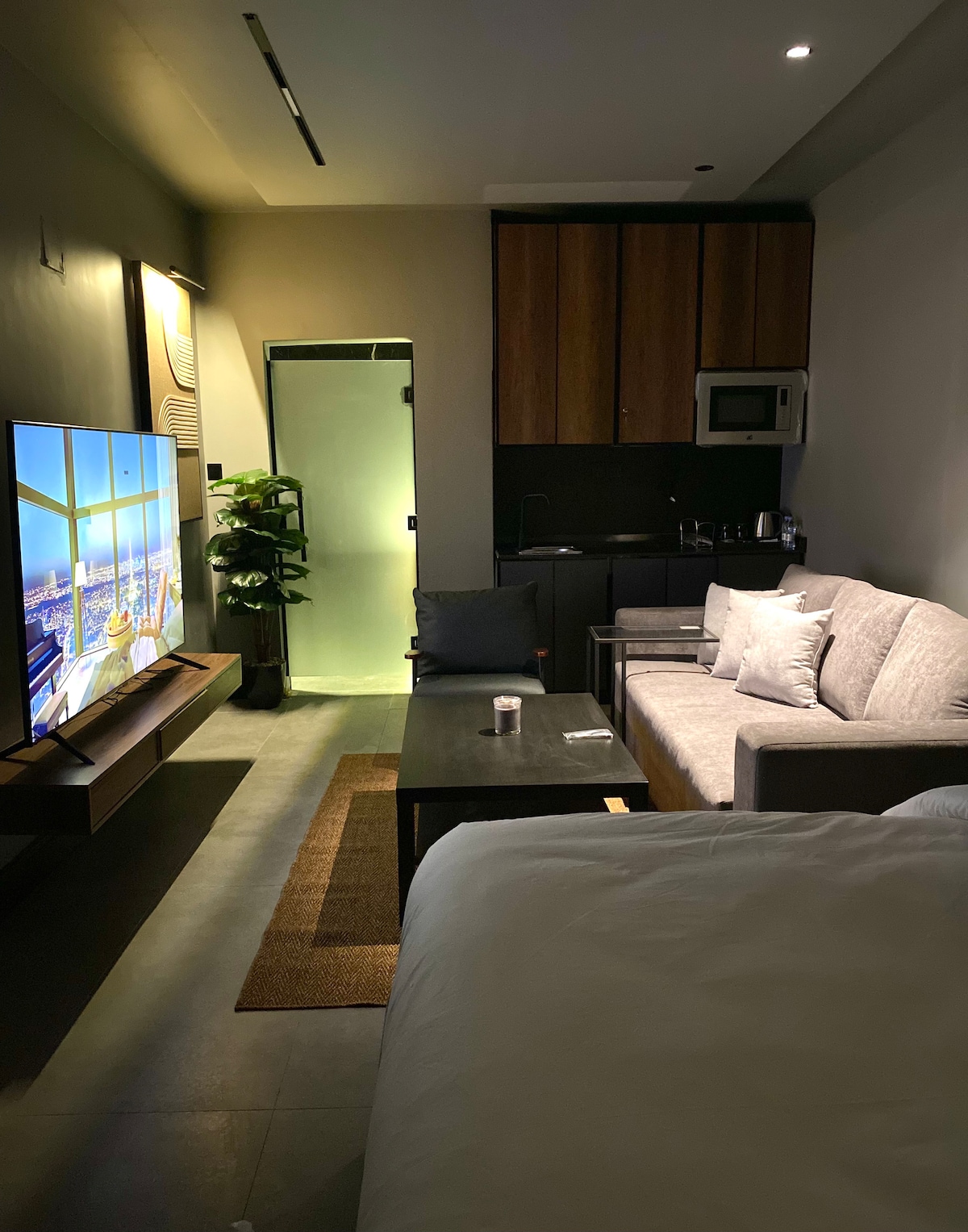 Lavado de autos 🚨🚙 gratis con cada reservación. Recompénsate en Irtahal Apartments, donde la elegancia se encuentra con la comodidad. Disfruta de un espacioso y acogedor salón con un televisor de 65pulgadas con Netflix y más, perfecto para aquellos que buscan un retiro tranquilo para estudiar, trabajar o divertirse. El dormitorio ofrece un ambiente relajado con una iluminación suave. Las comodidades incluyen una cafetera americana, cafetera turca, hervidor de agua, plancha de vapor, mini refrigerador y microondas