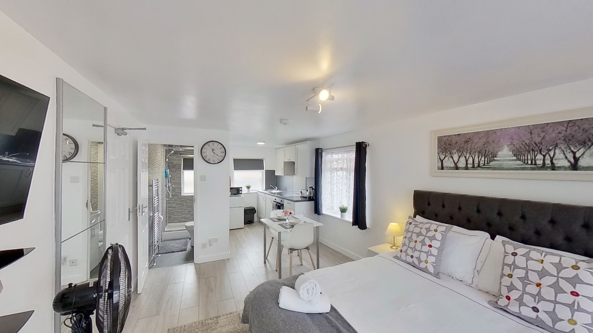 Pequeño pero bellamente creado apartamento independiente de un dormitorio con cocina, estudio/comedor y baño/aseo Cerca de lugares de interés, estación de tren, rutas de autobús y autopistas M2 / M20. Wifi superrápido, TV de pantalla plana, nevera/congelador, microondas combinado, vitrocerámica, máquinas de café/agua caliente y muchos extras. Cama doble con colchón de espuma viscoelástica Simba, sofá de cuero Aparcamiento fuera de la carretera y acceso completo a una gran zona ajardinada. También hay disponible un lugar seguro para guardar bicicletas.