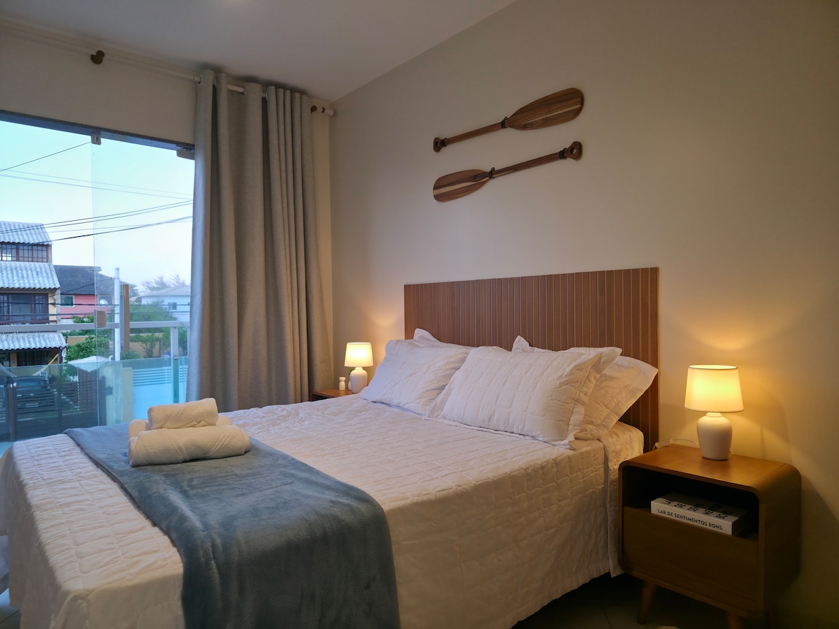 Casa Pé na Areia – Cabo Frío Disfruta de la comodidad de esta casa frente al mar, ideal para hasta 6 personas. Hay 2 dormitorios (1 suite) con aire acondicionado, una sala de estar con TV, una cocina equipada, una lavandería y un balcón perfecto para relajarse en la hamaca admirando el amanecer y el atardecer. El condominio ofrece seguridad, sala de juegos y espacio de barbacoa (cargo adicional). Praia das Dunas, con aguas cristalinas y arena blanca, está a tus pies, entre Praia do Forte y Praia do Foguete.