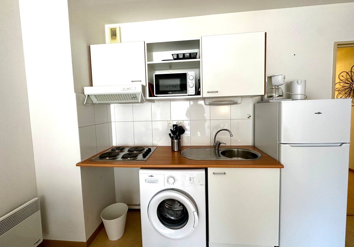 En la plaza central de Lodève, a 2 pasos del mercado (productores locales) y cerca de todos los comercios, este pequeño estudio de 23 metros cuadrados en la planta baja será el punto de partida perfecto para descubrir la región de Lodève (a 45 minutos de Montpellier). En coche: -Lac du salagou (a 15 minutos) -Circo de Navacelles (40 minutos) -Pueblo medieval «La Couvertoirade» (a 30 minutos) - Templo budista Lerab Ling (30 minutos) -Rutas de senderismo (GR653, GR71, ciudad etapa del Camino de Santiago de Compostela…)