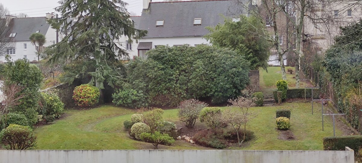 En el corazón del centro histórico de Quimper, la calle Kéréon y sus casas con coloridos bosques. Estudio en el segundo piso, a los pies de la catedral, ubicación excepcional. Edificio con ventanas rojas/rosas en las fotos en el exterior. Wifi y TV conectada, caja de fibra. Se proporciona ropa de cama, toallas, sábanas y funda nórdica, la cama se hace antes de su llegada. Alojamiento clasificado 2 estrellas en alojamiento de turismo.