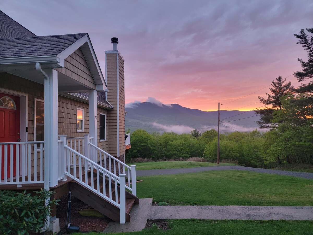 ¡Te damos la bienvenida a Sunny Hill Road! Estamos ubicados en una pequeña comunidad de casas privadas en un espacio abierto con vistas a las montañas. Esta unidad de un dormitorio tiene todo lo necesario para disfrutar de tu estancia en las Catskills. Relájate en la terraza privada o en el interior con vistas increíbles desde todas las ventanas. La cocina está totalmente equipada y lista para cocinar una comida completa y luego disfrutarla en el comedor con vistas a las montañas. ¡Es tranquilo y relajante aquí, increíblemente hermoso en las cuatro estaciones!
