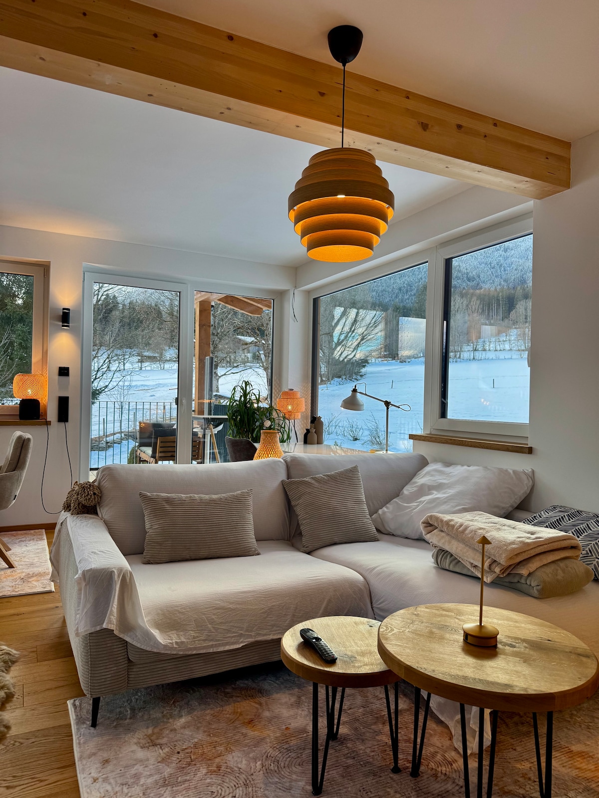Rückzugsort mit Panorama – stilvolles Obergeschoss-Apartment mit traumhaftem Blick auf die umliegenden Berge, Wälder, Felder und das Steinerne Meer. Große Fensterfronten holen die Alpenkulisse DIREKT in den Wohn-Küche Bereich und die beiden Schlafzimmer. Hochwertige, maßgefertigte Schreinerarbeiten schaffen eine warme, gemütliche Atmosphäre. Zentral gelegen in der größten Skiregion Salzburgs. Leogang, Saalbach, Maria Alm, Hochkönig, Zell am See und Kaprun sind in 15–20 Minuten erreichbar.