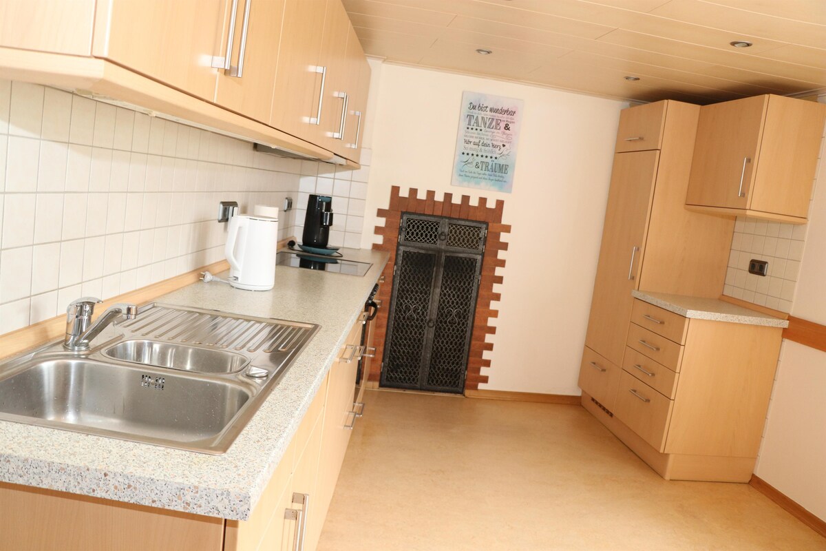 El apartamento (85 metros cuadrados) Waldeck está justo en el borde del bosque y está ubicado en la planta baja de mi casa de 2 familias. Se puede llegar a través de una entrada independiente. La sala de estar tiene un sofá cama de esquina extraíble y un sofá cama separado. Acceso a la terraza y al jardín posible. El comedor consta de un grupo de comedor con capacidad para 6 personas. También se proporciona cocina totalmente equipada. El dormitorio está amueblado con una cama doble. El nuevo baño está equipado con ducha y lavadora.