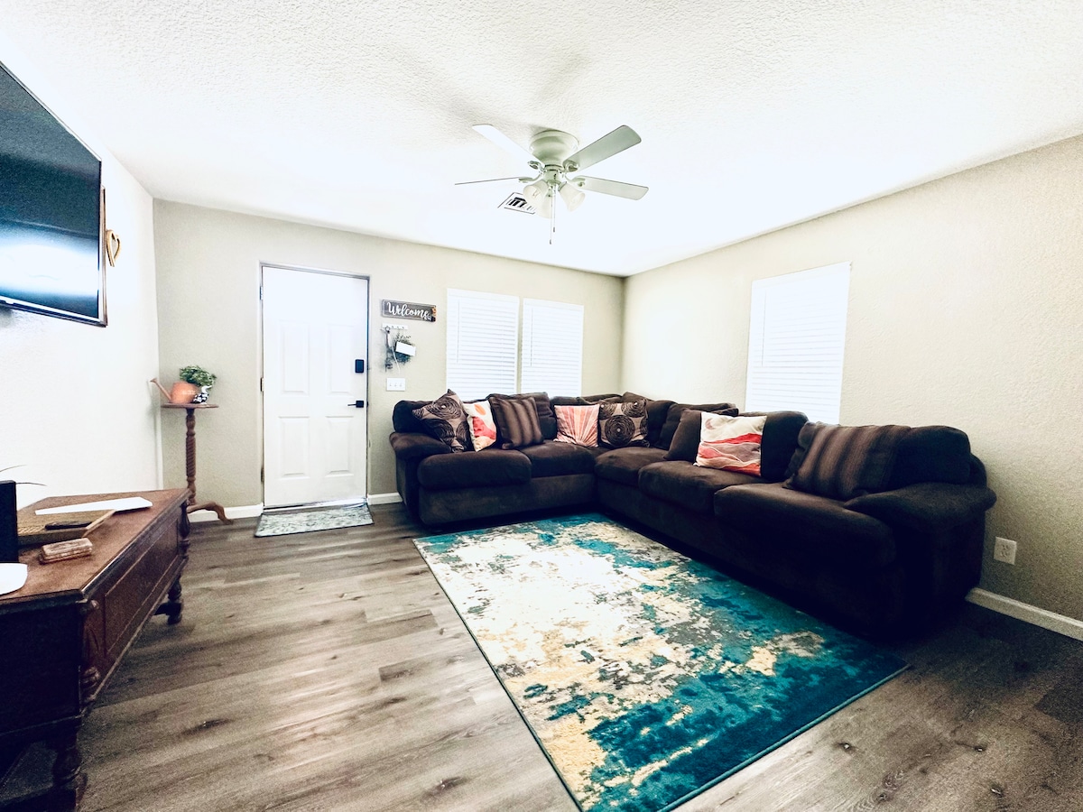Deja que este sea tu hogar lejos de casa. Disfruta de tu estancia limpia y cómoda en este alojamiento familiar. Esta casa es engañosamente grande y espaciosa. Incluye un gran patio trasero para aparcamiento adicional. En el interior encontrarás 2 dormitorios con cómodas camas de felpa, un baño, una gran cocina y comedor, junto con una amplia sala de estar que ofrece un sofá cama para personas adicionales. Cada dormitorio tiene su propia unidad de aire acondicionado. Ubicado en el centro de un barrio tranquilo, lo que hace que tu estancia sea agradable y cómoda.