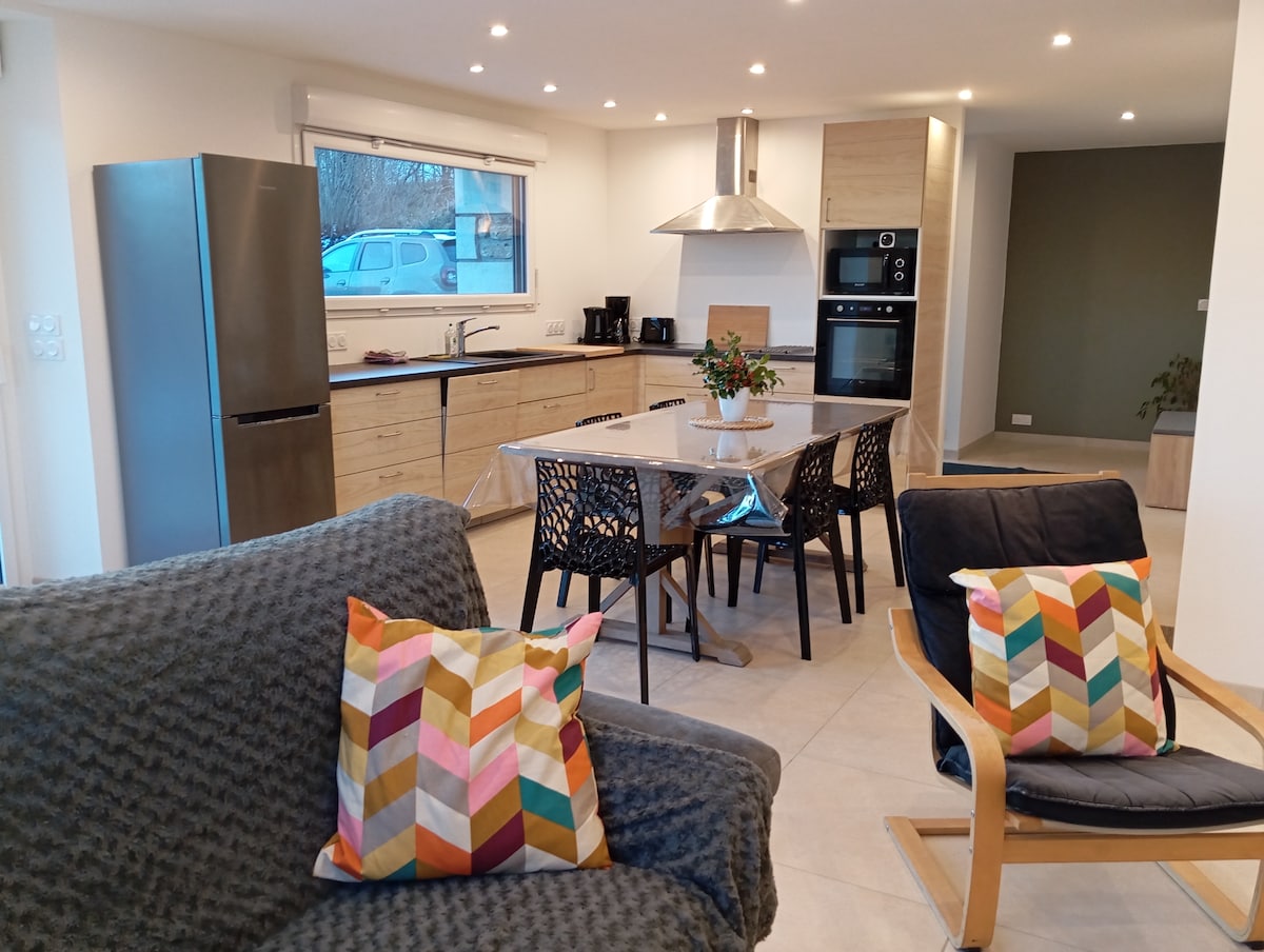 Casa rural dúplex, acabados y equipamientos de calidad, clasificada con 3 estrellas (alojamiento de turismo). Centro de la ciudad de Saint Julien Chapteuil, independiente en una calle sin salida privada tranquila, todos los comercios. Alojamiento y equipamiento nuevo (puesto en servicio en agosto de 2019) Dos dormitorios abuhardillados en la planta superior, sala de estar con cocina americana y baño con aseo en la planta baja
