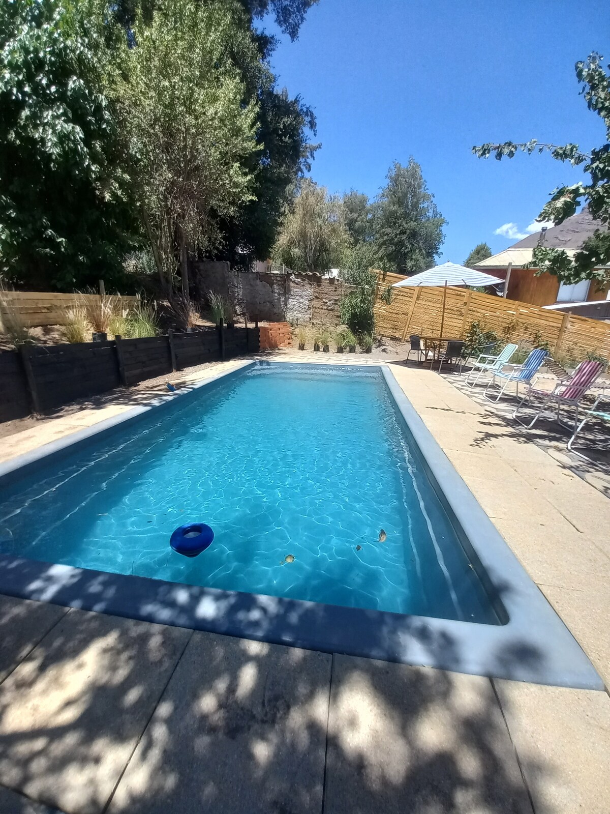Cabaña y piscina uso exclusivo, tranquilo poblado El Ingenio, a 18km Plaza San José de Maipo. Casa 65 m2, terreno 500 m2. Caben 6 personas, 2 dormitorios, 2 baños, 1 cama matrimonial, 1 cama nido y 1 camarote. Hay sabanas y toallas, cocina equipada, bosca leña, piscina de 3,5x5mt x 1.30 mt . Sitio cercado, se aceptan 2 MASCOTAS. PROHIBIDO MUSICA JARDIN. Mín. 2 noches. Llega bus, colectivo, auto, bicicleta, camino pavimentado. Hay Wifi, Almacenes. Vista cordillera.