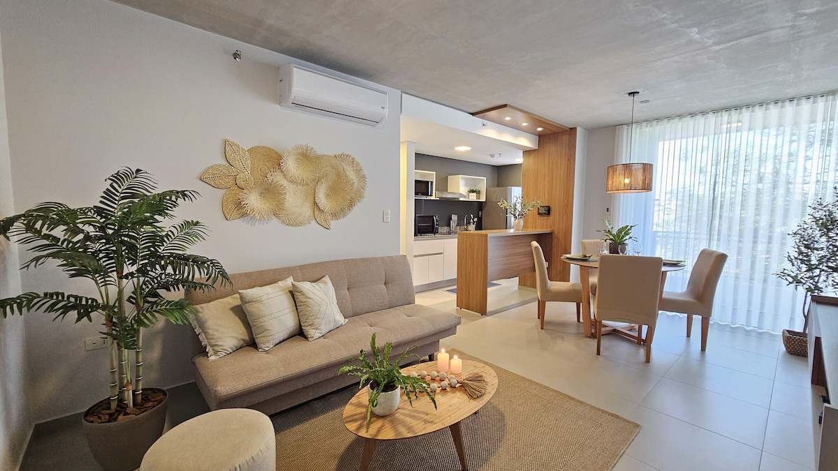 Departamento moderno, súper equipado, con balcón, parrilla, vista panorámica desde el piso 24 y excelentes servicios: - Piscina - Coworking - Quincho - Cine - Estacionamiento por autoelevador (auto pequeño/mediano) - Seguridad 24/7 Gran ubicación: - A 5 minutos del Eje Corporativo, el Shopping del Sol y el Paseo La Galería. - A 10 minutos de la Costanera y el Puente Héroes del Chaco. - A 15 minutos del Aeropuerto Internacional Silvio Pettirossi. Incluye Wi-Fi · Smart TV · Colchones premium