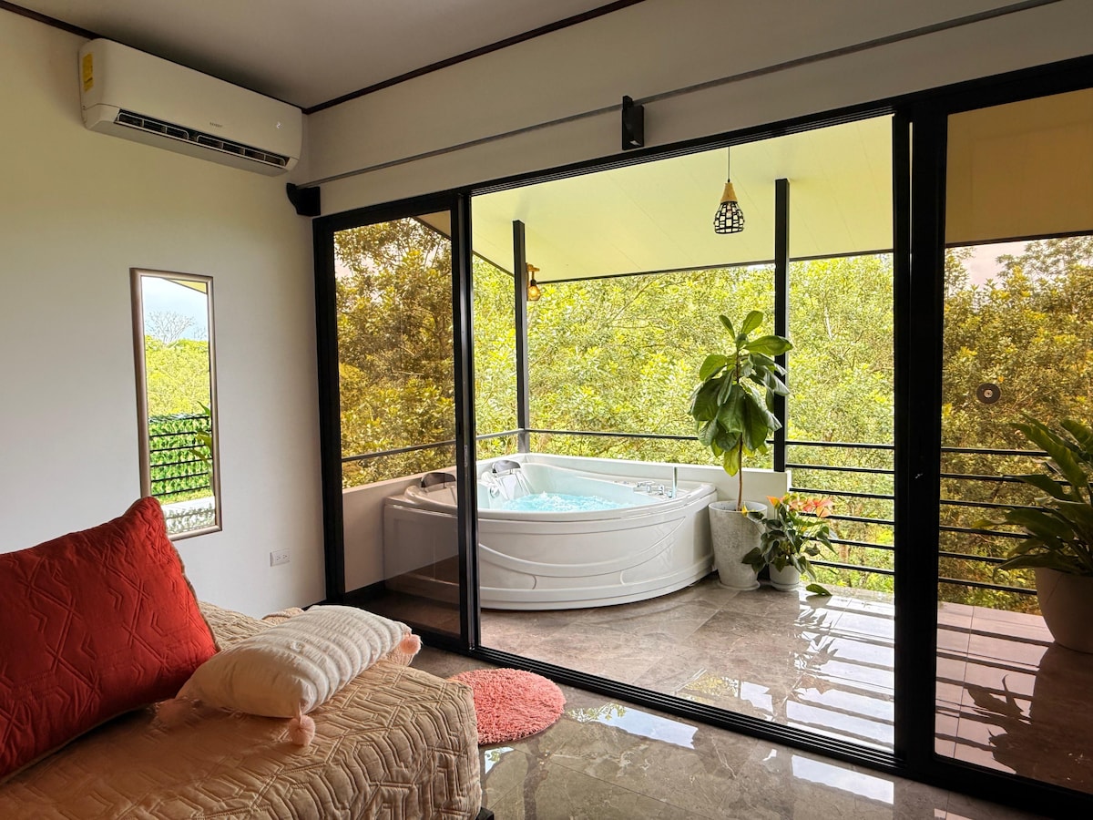 Esta romántica, lujosa y relajante villa, le ofrece la mejor experiencia sensorial. Con un increíble jacuzzi inmerso en un jardín tropical. Ubicada a solo 3 cuadras del centro de Fortuna y al mismo tiempo, alejada de las bulliciosas calles. 100% equipada con: área de cocina, internet de fibra de 200Mbps, enorme cama king, aire acondicionado, smart tv de 55 '', baño único rodeado de exuberante naturaleza. Una terraza inferior y una terraza superior con la mejor vista panorámica del volcán arenal.