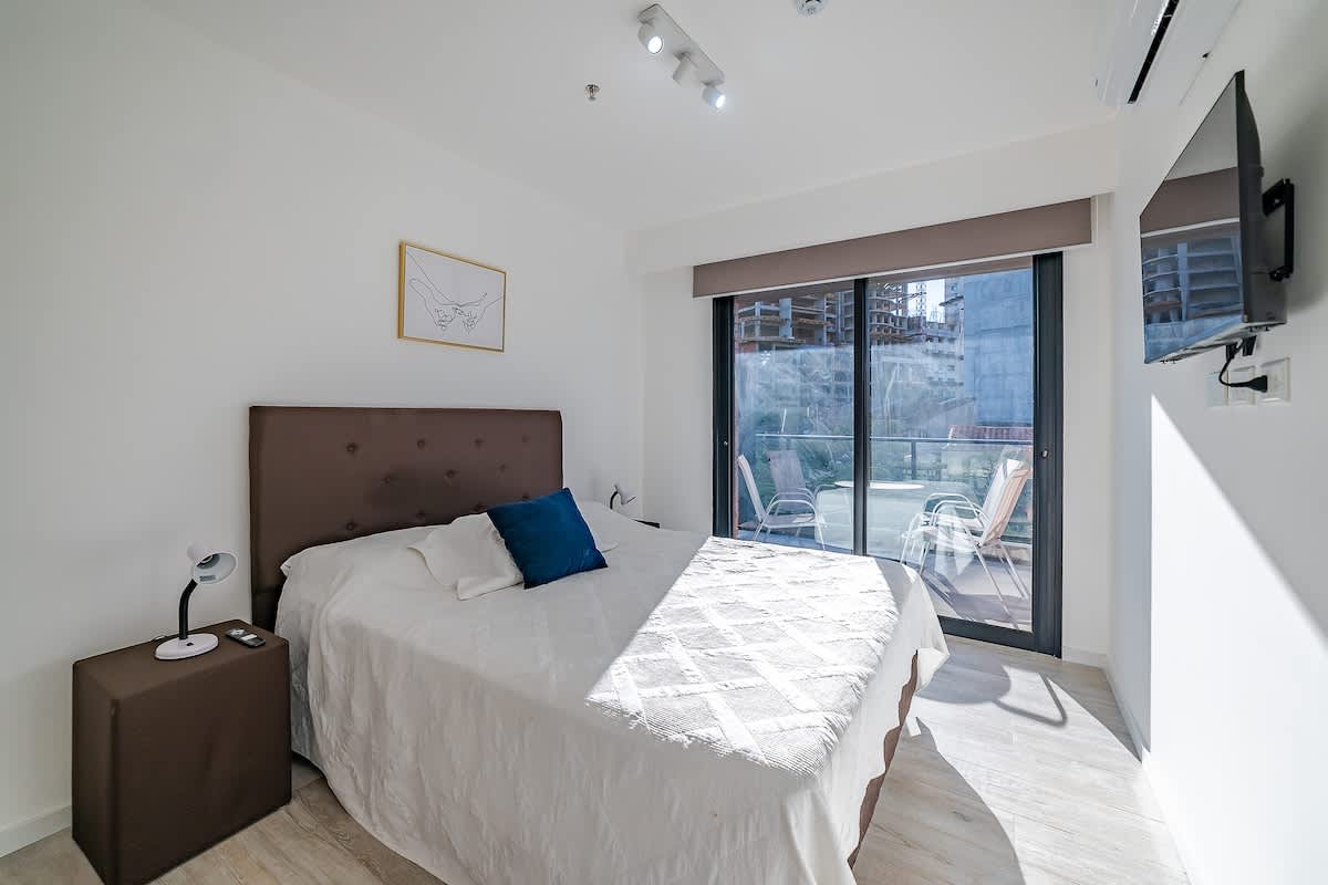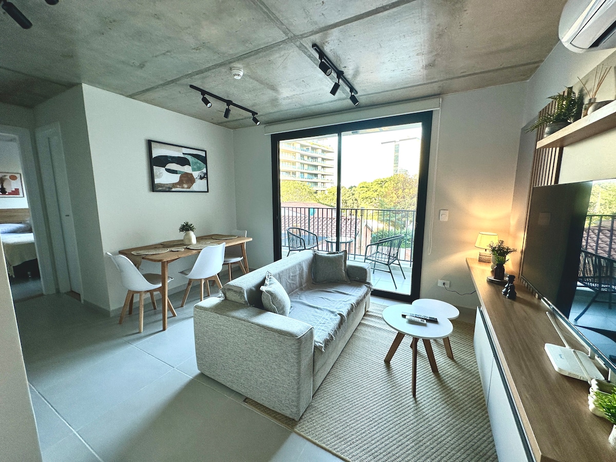 Moderno y luminoso departamento de 1 dormitorio, ubicado a pasos del Shopping del Sol y Paseo La Galería. A 10 minutos del aeropuerto. Disfrutá de un espacio cuidadosamente decorado, con living integrado, cocina equipada con electrodomésticos de alta gama y balcón con vista a la ciudad. El dormitorio cuenta con cama queen, iluminación cálida y aire acondicionado en todos los ambientes. Perfecto para estadías cortas o largas, con fácil acceso a los principales centros comerciales y restaurantes.