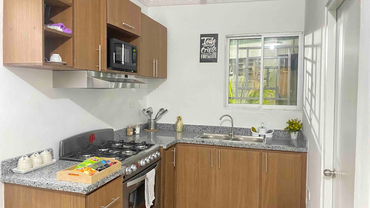 Vive la experiencia de un espacio moderno y céntrico, a solo dos calles del Estadio Tetelo Vargas y supermercados locales y a 15 minutos de las hermosas playas de Juan Dolio. El apartamento ofrece aire acondicionado tanto en la sala como en el dormitorio, que cuenta con una cómoda cama king size, mientras que la sala dispone de un sofá cama full. Además, disfrutarás de Wi-Fi, una cocina totalmente equipada y un área de lavado, diseñado para que tengas una estadía cómoda e inolvidable.