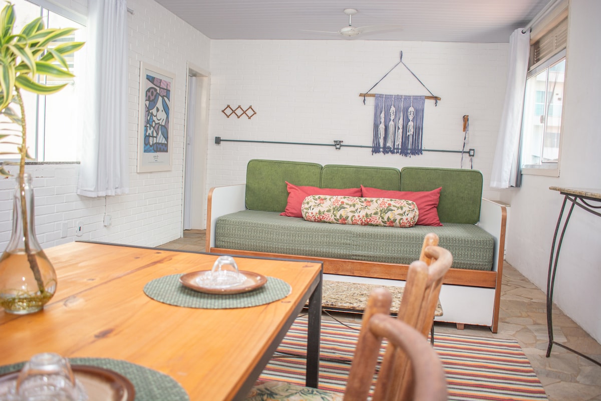 Experimenta el encanto de nuestro loft independiente, en el tercer piso de una casa triplex frente a la playa. Dormitorio doble con aire acondicionado, cocina totalmente equipada y dos amplias salas de estar con sofás cama y una hamaca. Zona de barbacoa cubierta con vistas a la ciudad. Una estancia acogedora y conveniente, a pocos pasos de las dunas y Forte Beach.