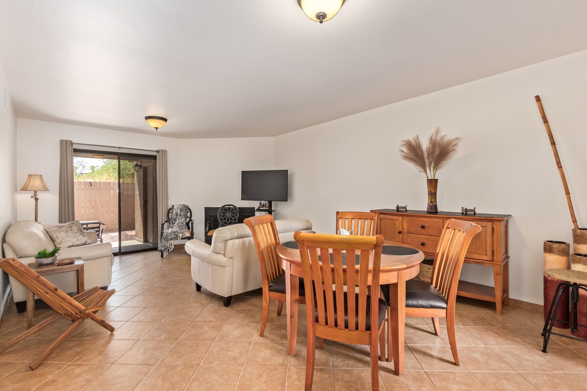 Relax in our pet-friendly townhome. It's bright and comfortable with a private walled patio, grill, sky deck and onsite parking. Excellent amenities, with hotel-grade linens and towels. Community salt water pool and hot tub (both heated year round). Indoor gas fireplace. Free wi-fi and a desk nook for remote work. Quiet, safe neighborhood. Walk to the DeAnza trail and the #1 Small Art Town in America. Easy drive to Tubac Golf Resort! Perfect for exploring Tubac. AZ TPT compliant