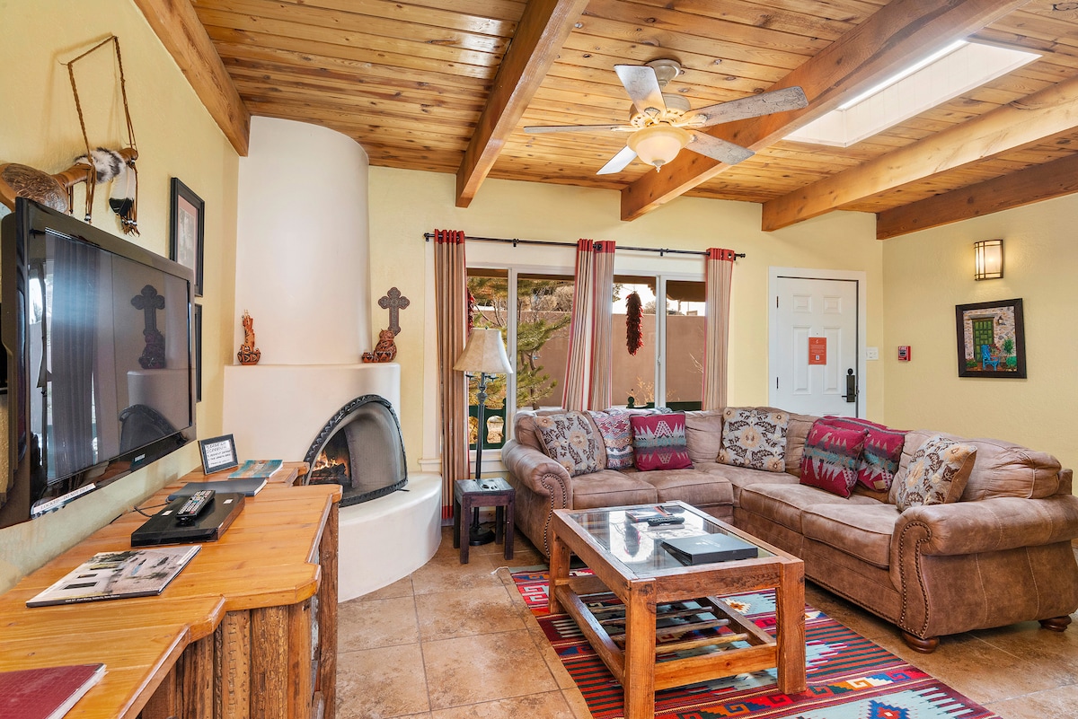 Gorgeous newly remodeled and well appointed condo with stunning mountain views from our covered veranda in Casa Solana neighborhood, just north of historic downtown. It is only 5 min drive to the Santa Fe Plaza, Railyard Arts District, downtown and Georgia O'Keeffe Museum. It is a true gem and has a cozy kiva fireplace with adobe banco seating, exposed beams, classy Pueblo and Spanish Colonial high-end touches. We are committed to making your stay delightful and unforgettable!