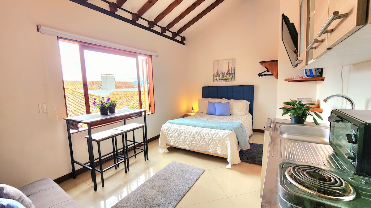 Disfruta de un apartaestudio en un espacio tranquilo y céntrico, a pocos pasos de la Plaza Mayor. Ubicación inmejorable, enfrente del Museo del chocolate. Es un hermoso loft dentro de un aparta hotel, ubicado en la cuadra principal de Villa de Leyva, con baño privado de agua caliente, WiFi, TV por cable y totalmente independiente. Tiene una mini cocina para hacer algunos alimentos básicos. También hay un pequeño refrigerador. Con una vista maravillosa, descansa mejor que en casa 🩷