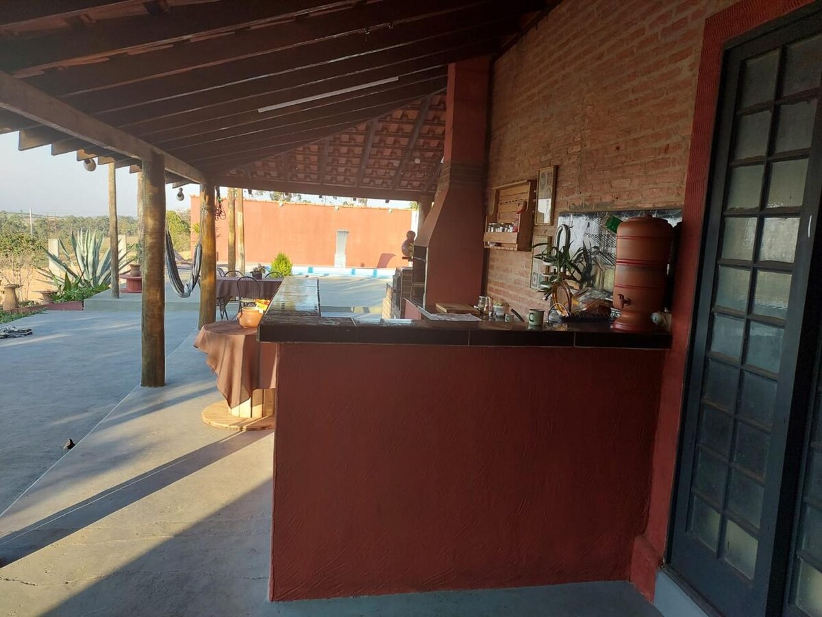 Relájese con toda la familia en este alojamiento tranquilo. Granja para descansar y disfrutar. No alquilamos para fiestas con DJ o cargo en la portería. La granja tiene 2 dormitorios; un baño interno; un baño externo; piscina; ducha; barbacoa; congelador y nevera dúplex; cocina de 4 hornillas y encimera. Una habitación tiene 1 cama doble con armario, y la otra 2 camas individuales y 5 colchones dobles. Situado en Estancia Araras, a 6 km de la ciudad de São Sebastião do Paraíso - MG.