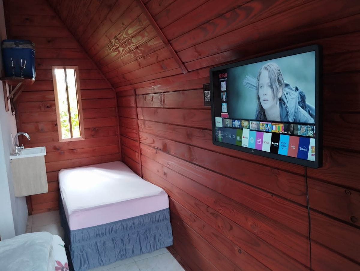 Servimos desayuno y está incluido en la tarifa diaria. Petit Suite está equipada con TV inteligente, wifi gratuito, aire acondicionado, minibar para tus bebidas y refrigerios favoritos. El baño, aunque compacto, tiene una ducha que proporciona una experiencia diferente en un espacio optimizado. Trajes de cama y baño. La suite Pétit Nirvana es ideal para aventureros que buscan comodidad sin frescura. Aparcamiento al aire libre frente a la Pousada.