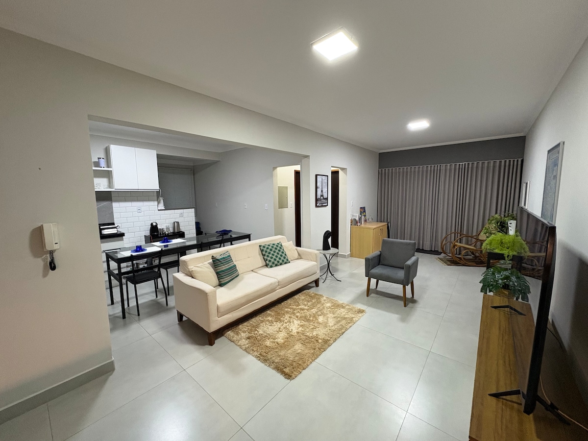 Apartamento nuevo en pequeño edificio familiar, situado a 15-30 minutos del Parque das Águas y del centro de la ciudad, dependiendo del ritmo de la caminata. En coche se tarda menos de 5 minutos. Lugar tranquilo, al fondo se encuentra el bosque nativo del Parque.