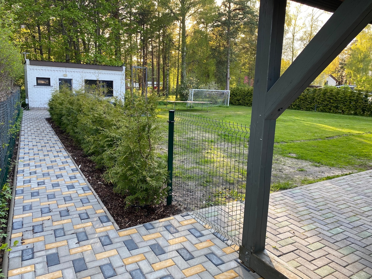 All season retreat house for a couple or a family with up to 2 children. Made with love, the best materials and care to wellbeing. Surrounded by wild berry fields and a pine forest. Peaceful and very relaxed neighbours, that offer options for outdoor sports. 5 min walk on a lovely street leads to the sea : white dune, pedestrian roads and hiking trails. 5 min walk in the other direction leads to Rimi and Top grocery stores and the train station. 10 min walk to the local market every Friday.