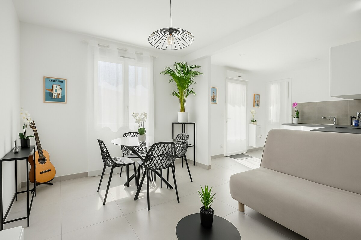 Bonito estudio nuevo de 12 m2 en la planta baja cerca de las playas (Sérignan, Valras y Vendres ) luminoso a 10 minutos a pie del centro de la ciudad y sus múltiples mercados . Urbanización tranquila, posibilidad de aparcar en frente de la casa. De abril a octubre , puede disfrutar de una terraza para tomar el desayuno al sol. Cocina americana equipada, placa vitro, nevera, microondas, cafetera. Sofá cama BZ Cuarto de baño privado con inodoro, ducha. Se proporcionan toallas y sábanas. Aire acondicionado a partir de junio de 2023
