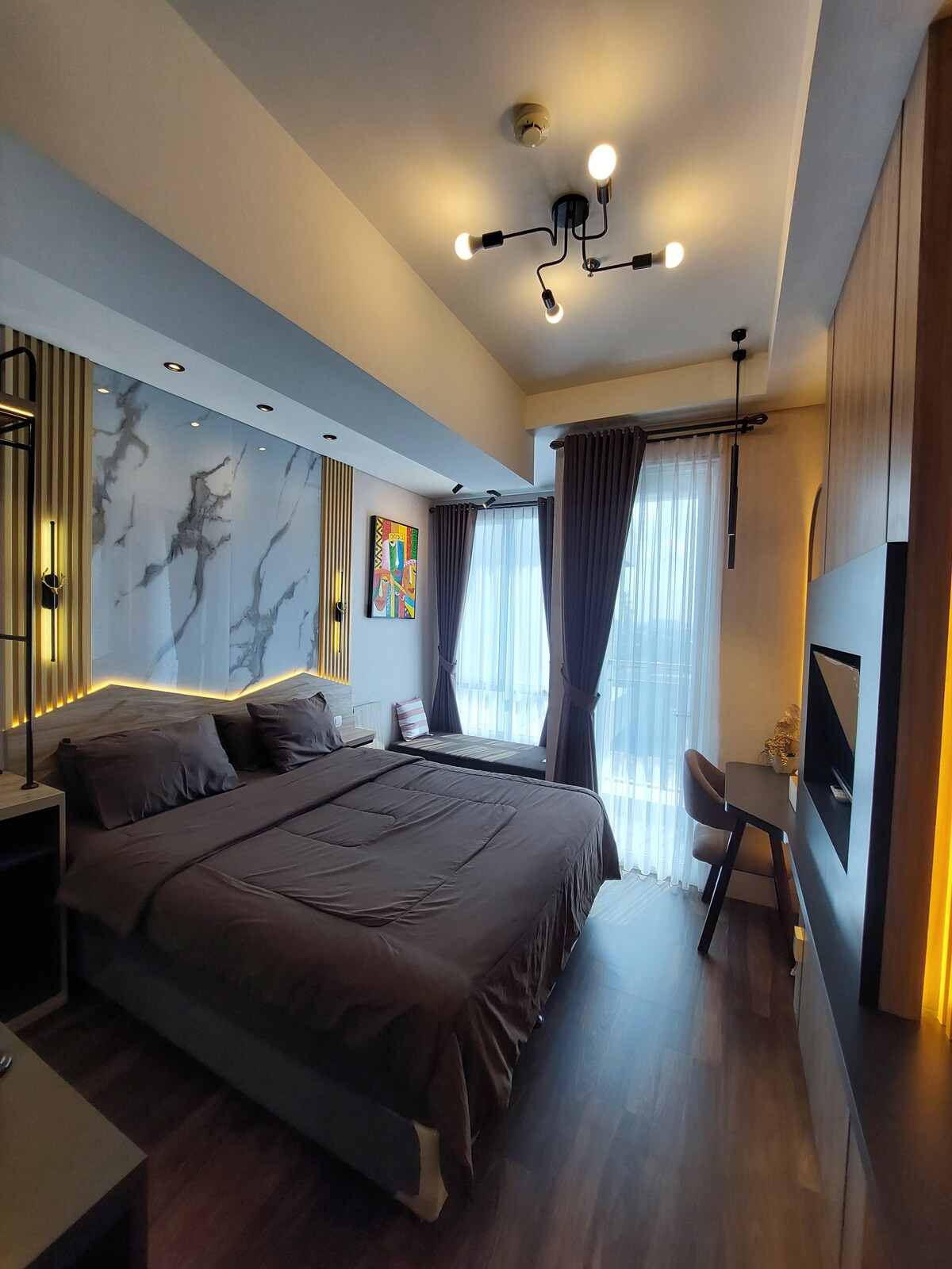 Cerca de JIEXPO y JIS, nuestro estudio en el apartamento Maplepark ofrece comodidad moderna, internet de alta velocidad y Netflix. El diseño de planta abierta cuenta con muebles elegantes, abundante luz natural y zonas de trabajo y dormitorios sin problemas. La cocina bien equipada y la lujosa zona de dormitorio garantizan comodidad y practicidad. Con fácil acceso a tus eventos y un balcón privado con vistas a la piscina, este estudio combina la sofisticación urbana con un encanto acogedor, lo que lo convierte en el hogar perfecto en el corazón de Yakarta.