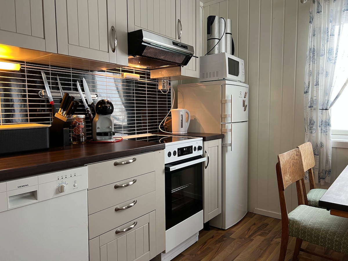 El apartamento se completó en el verano de 2023. Es luminoso y moderno y consta de una cocina con todas las instalaciones, una sala de estar con zona de sofá y TV, un baño con una gran ducha, un pasillo y un dormitorio con una cama de 150 cm. Todas las habitaciones tienen una ventana con vistas a la zona del puerto de Hammerfest, Melkøya y Håja. El departamento se encuentra en una calle lateral sin tráfico, a solo 5 minutos a pie del centro de la ciudad. Lamentablemente, no tenemos aparcamiento porque la calle es demasiado estrecha.