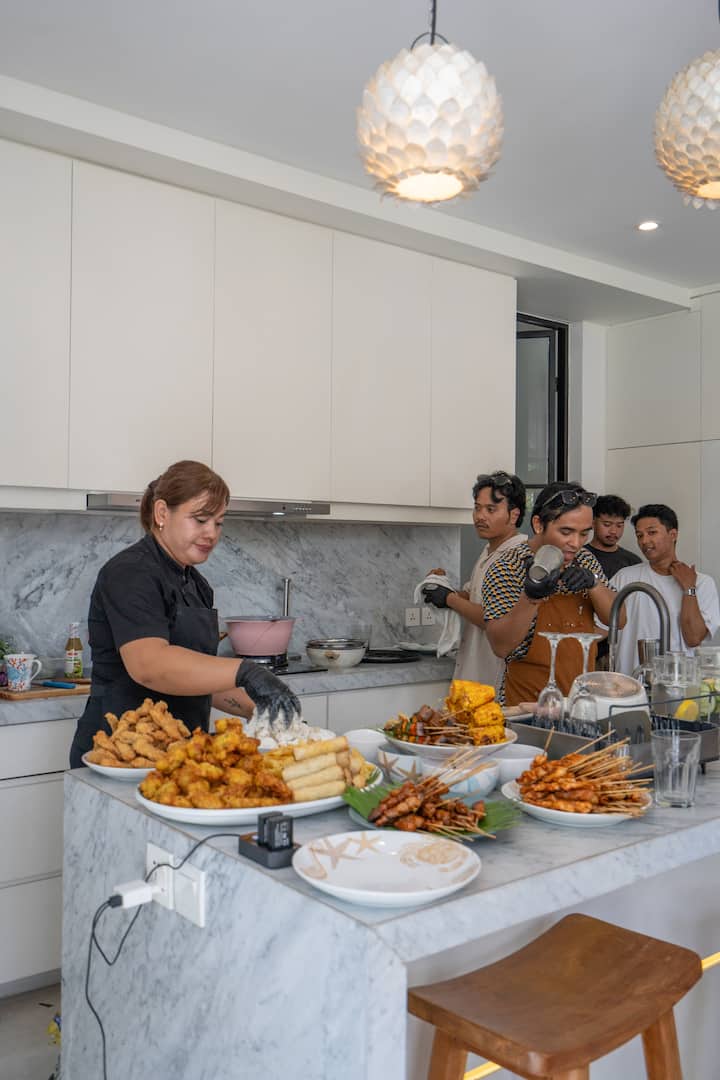 Organiza una animada cena de barbacoa en tu villa. Incluye rollitos de primavera indonesios y ensalada mixta, seguidos de arroz o arroz frito, papas a las finas hierbas, verduras a la parrilla y maíz. Las selecciones de barbacoa incluyen langostinos, pescado, ostras, costillas de cerdo, filete de ternera y pollo a la parrilla con salsas variadas. Termina con tiramisú, mousse de chocolate, fruta o coco joven.