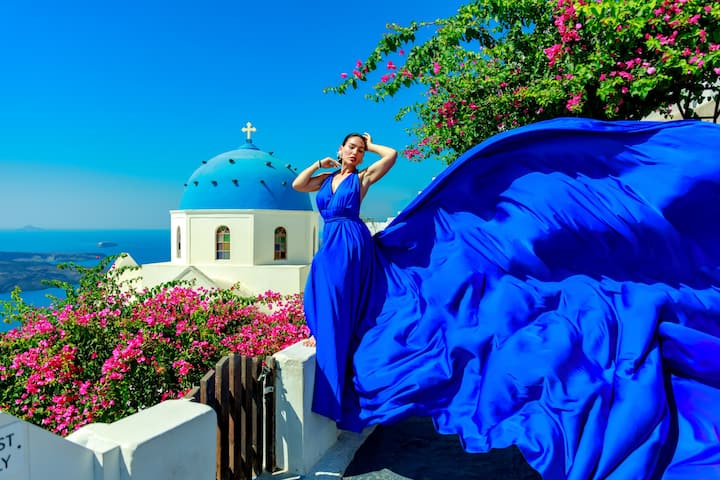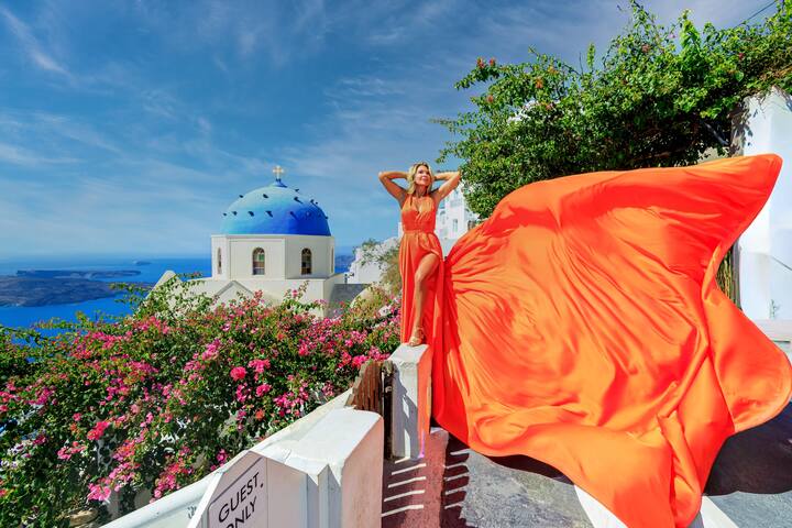 Sesión de fotos privada en Santorini con vestido volador
