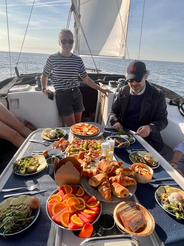 Entrega en el puerto de Barcelona, directamente en la plataforma del barco. Incluye croissants franceses, mini pains au chocolat, madeleines o financiers, mini burgers brunch, mini quiches francesas, jamón ibérico y embutidos, quesos seleccionados, brochetas de tomates cherry y mozzarella, banderillas de frutas de temporada, aguacate y huevos, focaccia artesanal, y pan rústico con mantequilla. Servilletas y utensilios biodegradables incluidos.