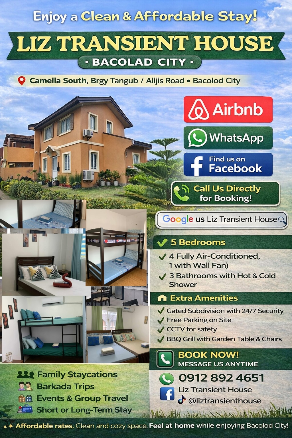 Relájate para unas vacaciones familiares en esta casa de 3 dormitorios situada cerca del corazón de la ciudad de Bacolod. Ubicada en el bloque 1 del lote 11B, villa fe subdivision, brgy villamonte. Válido solo para 5 personas, pero si es con huésped adicional, con tarifas adicionales. La zona es muy accesible para el transporte, como jeepneys y triciclos. Se encuentra a solo 7 minutos en auto del New Government Center, The Upper East by Megaworld y Lopue 's East Center. También a solo 15 minutos en auto del aeropuerto de Bacolod-Silay.