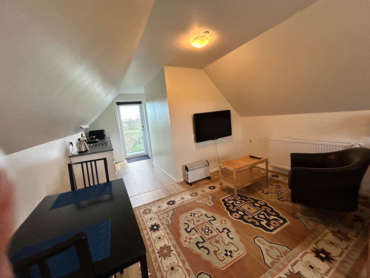 Habitación grande y luminosa recientemente renovada en 1 piso con fantásticas vistas (y con la posibilidad de 2 camas adicionales además de una cama doble además de una cama doble) y una habitación más pequeña recientemente renovada con techos abovedados en la planta baja, también con bonitas vistas y cama doble. También hay una gran sala de estar con la posibilidad de "cine" hygge con un gran lienzo, un juego de futbolín o simplemente relajación pura con un buen libro. El baño está en la planta baja. Hay un bonito sofá cama y buenos colchones de caja.