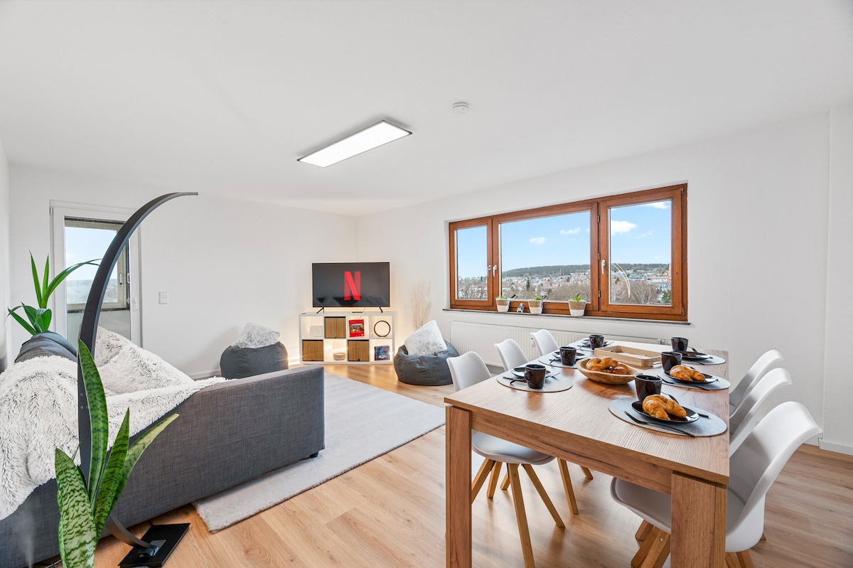 Bienvenido a nuestra moderna y lujosa suite «View4you», que te ofrece todo lo necesario para una gran estancia a corto o largo plazo en Böblingen/Sindelfingen: - 2 cómodas camas dobles tamaño king. - Sofá cama para el quinto y sexto huésped - Smart TV de 55 pulgadas y NETFLIX - Aparcamiento gratuito. - Amplia cocina con todo lo que necesitas - Café NESPRESSO. - Internet de alta velocidad. - En las inmediaciones se encuentran las principales empresas locales (Mercedes-Benz, IBM, HP, etc.), ferias comerciales y varias tiendas.