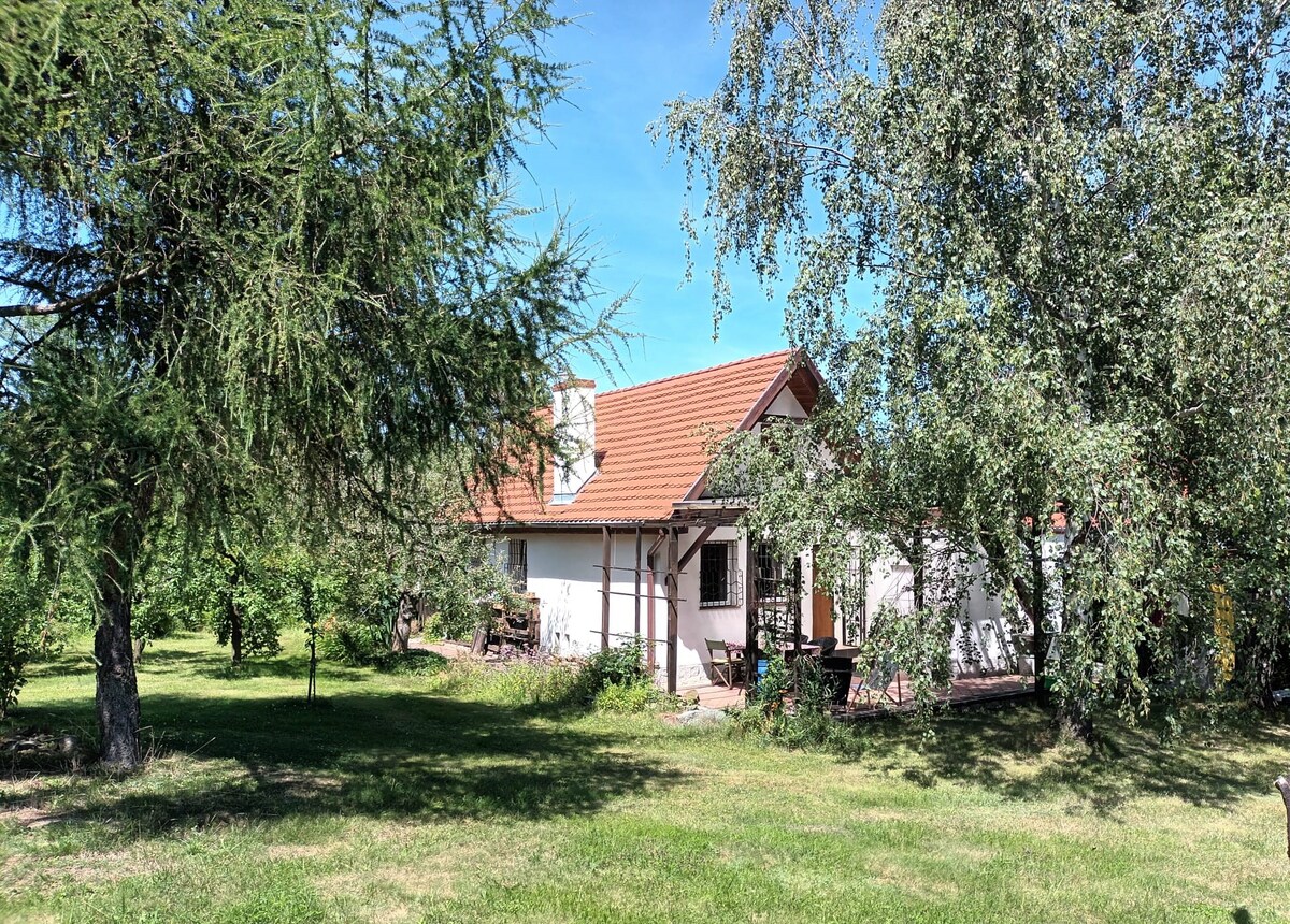Te ofrecemos una casa de madera con una vista relajante de las montañas del búho, desde la cama puedes admirar hermosas y románticas puestas de sol con una copa de buen vino en la mano. Los rayos cálidos del sol naciente pueden despertarte por la mañana. Usa la terraza, si tienes un poco de suerte, verás ciervos pasando, que tienen su oasis en un bosque cercano. Relájate en este espacio tranquilo y elegante. Pero estaría garantizado :)