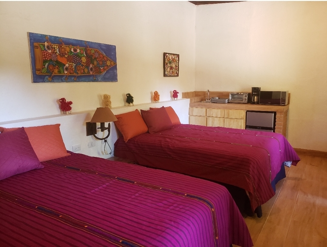 Acogedor studio para 2 adultos o 2 adultos y 2 niños menores de 12 años. Cuenta con baño privado completo, cocineta que incluye un microhondas, mini refri, horno tostador, churrasquera tipo hibachi, 2 hornillas eléctricas y cafetera. Tiene solo vista al Volcán de San Pedro que se observa en las fotos. En días nublados no se ven. Tiene acceso directo al lago por un corto sendero.