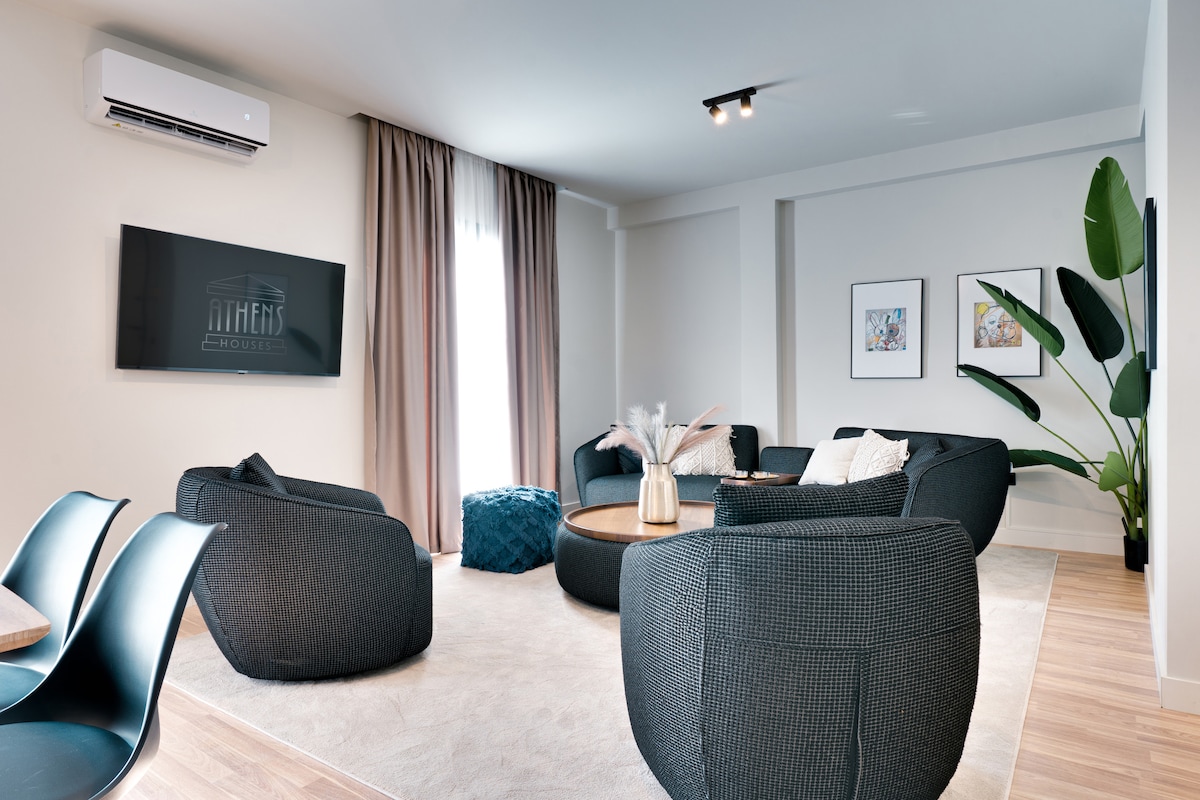 Apartamento grande de lujo en el centro de Atenas. Un apartamento totalmente equipado y totalmente renovado en marzo de 2022 con capacidad para 16 personas. A solo 2 minutos a pie de la estación de metro y a 5 del Museo Arqueológico Nacional. 2,5 baños, 1 sauna tradicional sueca, 5 dormitorios con armarios, ventiladores de techo AC, 6 televisores inteligentes grandes con Netflix y Amazon Prime, escritorio con iMac y una Playstation 4, 1 cocina totalmente equipada, sábanas frescas, mantas y toallas. Aparcamiento a 1 minuto a pie(8 € por día)