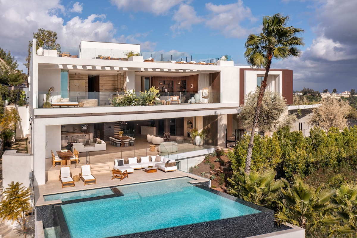Modern & spacious LA Dream Home: stunning open-plan living area with disappearing 12ft glass doors reveal a serene backyard, infinity-edge pool, hot tub, and outdoor dining beside a cozy fire pit. ☞ Pool + Hot Tub + BBQ ☞ Every Bedroom: bathroom + walk in closet+TV ☞ Private backyard + dogs OK* ☞ Fast wifi + Alexa 10 min → WEHO 20 min → Universal 30 min → DT LA ***SEE HOUSE RULES: The neighborhood is on high alert for disruptive guests. You will be fined $1000 and evicted***