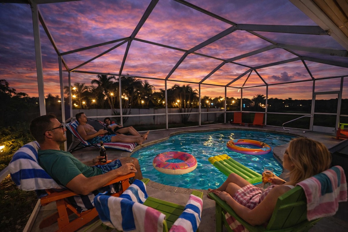 🌴 ¡Le damos la bienvenida a Turtle Cove, parte de la colección de alojamientos Luxe de Airbnb! Este refugio tropical se encuentra en el centro de Bradenton, a pocos minutos de las playas del golfo, del centro histórico y de la Academia IMG. Disfrute de su oasis privado en el patio trasero: 💦 Piscina climatizada ⛳ Putting Green Lugar para hacer🔥 fogata 🍔 Parrilla y comedor al aire libre 🎱 Mesa de billar 🌴 Amplio salón tropical Pase los días explorando las hermosas playas de Anna Maria Island, paseando por el centro histórico de Bradenton o relajándose junto a la piscina en su propio oasis privado.