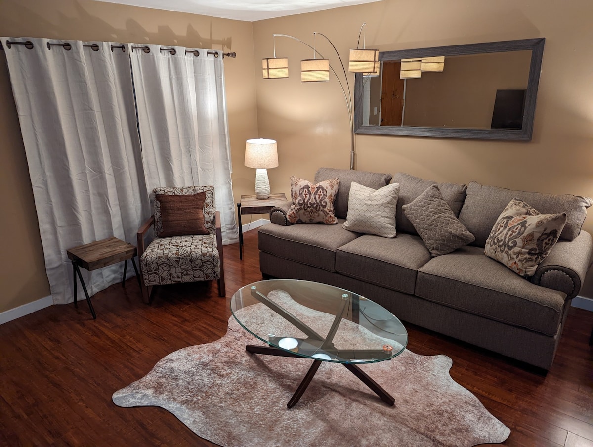 Los acabados elegantes y de alta gama completan este alojamiento completamente remodelado que ejemplifica el lujo cómodo. Este 1 dormitorio es espacioso y perfecto para una pareja o un viajero de negocios. ○ Televisor inteligente Roku de 50pulgadas con cable básico y aplicaciones ○ Cocina completa con lavavajillas, agua filtrada, máquina de hielo, Keurig, utensilios de cocina, utensilios de cocina, utensilios, etc. ○ Estacionamiento reservado en garaje (compacto), baño de azulejos con bañera/ducha, jabones ecológicos, calefacción central y aire acondicionado, mucha luz natural, caminable a los restaurantes, cierre electrónico fácil